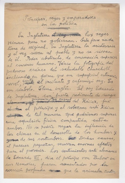 Príncipes, reyes y emperadores en la política [manuscrito] Joaquín Edwards Bello.