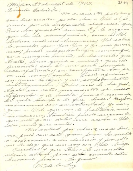 [Carta] 1943 ago. 28, México D.F [a] Gabriela Mistral [manuscrito] María de la Luz.