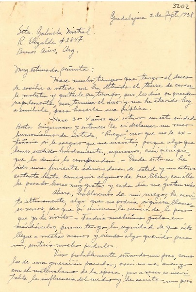 [Carta] 1938 sept. 2, Guadalajara, México [a] Gabriela Mistral, Buenos Aires, [Argentina] [manuscrito] Nila Amaral Otáñez.