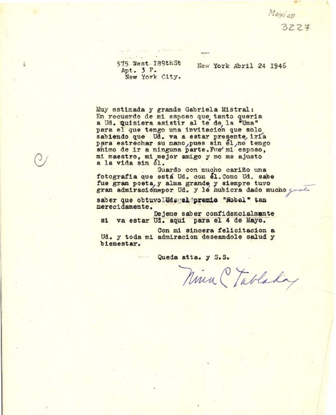 Mistral, Gabriela - Manuscritos mexicanos - Aguilar, Manuel - Correspondencia