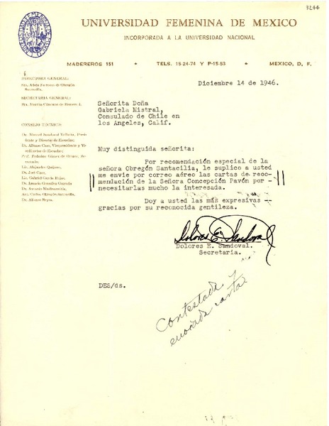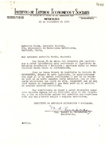 [Carta] 1941 dic. 23, México, D. F., México [a] Gabriela Mistral, Ministerio de Relaciones Exteriores, Santiago, Chile [manuscrito] Manuel A. Hernández.