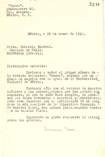 [Carta] 1942 ene. 26, México, D. F., México [a] Gabriela Mistral, Consulado de Chile, Nichteray, Brasil [manuscrito] Emma Saro.