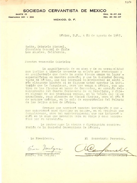 Mistral, Gabriela - Manuscritos mexicanos - Hernández, Manuel A. - Correspondencia