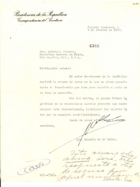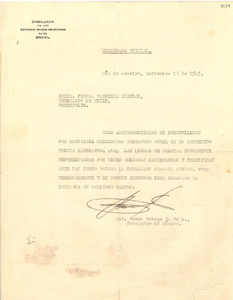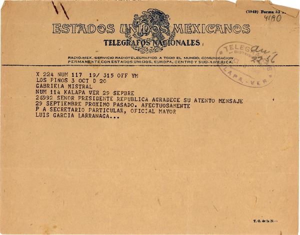 [Telegrama] 1948 oct. 3, Los Pinos, México D.F. [a] Gabriela Mistral, Jalapa, Vera[cruz], [México] [manuscrito] Luis García Larranaga.
