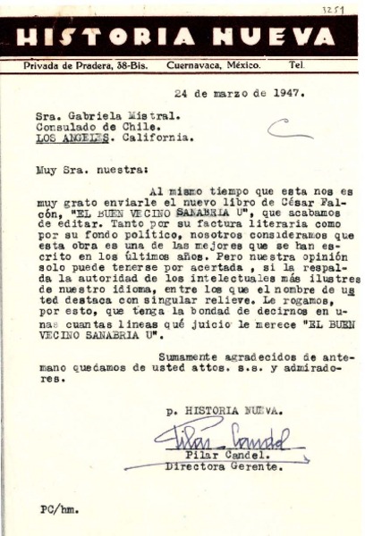 [Carta] 1941 mar. 24, México, D. F., México [a] Gabriela Mistral, Ministerio de Relaciones Exteriores, Santiago, Chile [manuscrito] Manuel A. Hernández.
