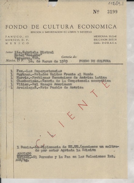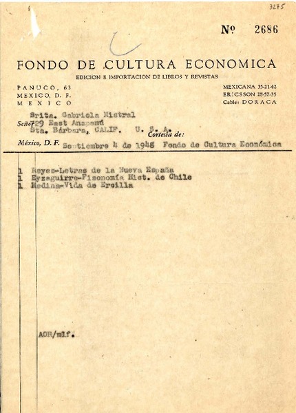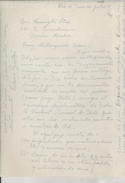 [Carta] 1942 oct. 3, [México] [a] Srta. Gabriela Mistral, Consulado de Chile, Río de Janeiro, Brasil [manuscrito] Un amigo.