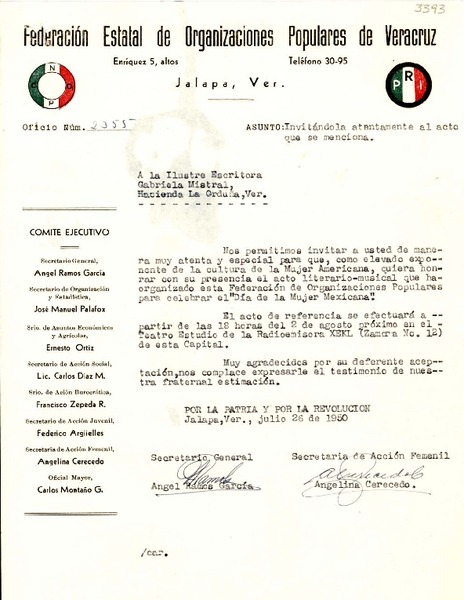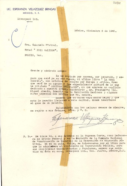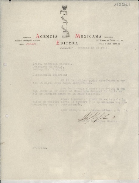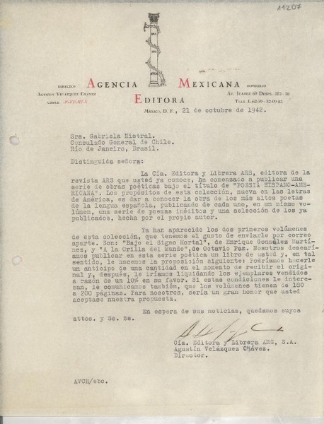 [Carta] 1942 oct. 21, México, D. F., México [a] Gabriela Mistral, Consulado General de Chile, Río de Janeiro, Brasil [manuscrito] Agustín Velázquez Chávez.