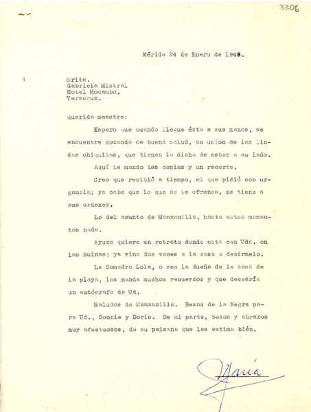 Mistral, Gabriela - Manuscritos mexicanos - López, María - Correspondencia