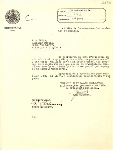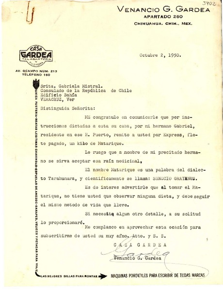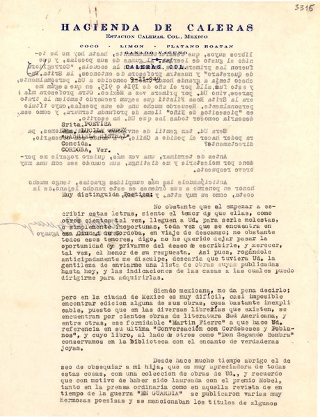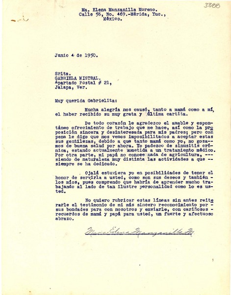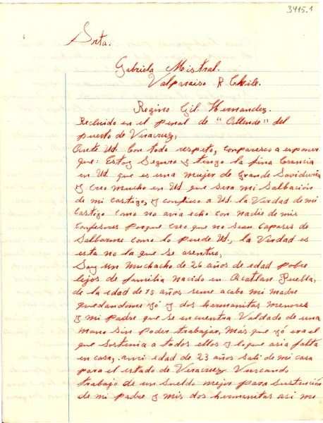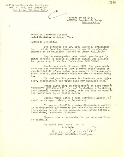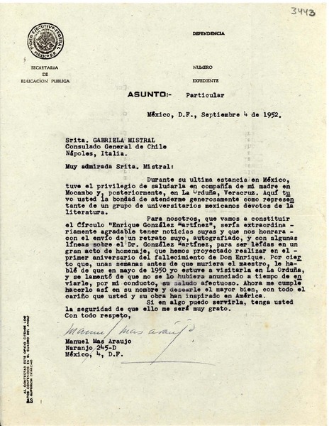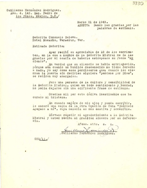Hernández, Manuel A. - Manuscritos mexicanos - Correspondencia - Mistral, Gabriela
