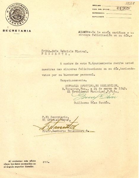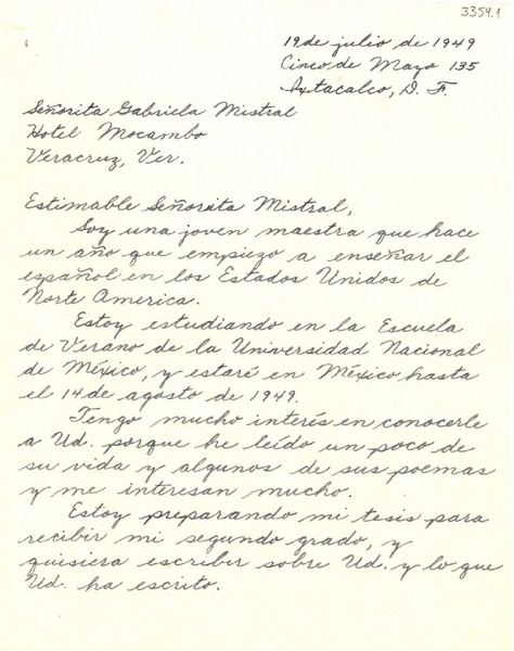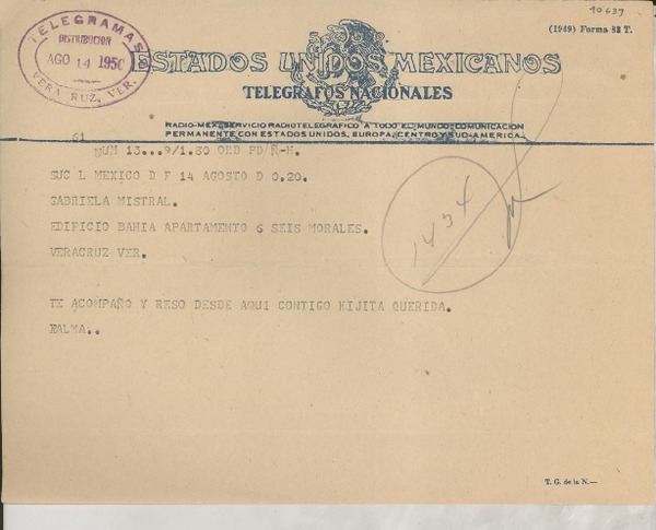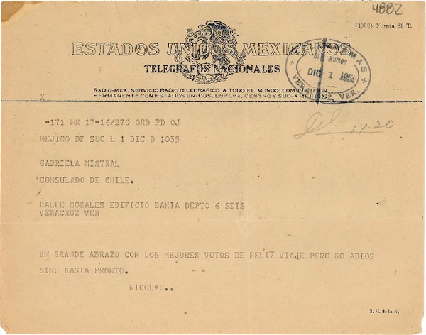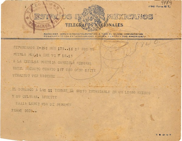 [Telegrama] 1949 ago. 29, México D.F. [a] Gabriela Mistral, Hotel Mocambo, Veracruz, [México] [manuscrito] De un amigo.
