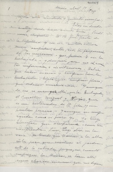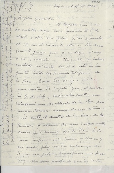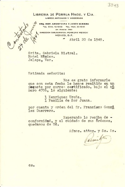 [Carta] 1943 abr. 2, México D.F. [a] Gabriela Mistral, Río de Janeiro, Brasil [manuscrito] Alfonso Reyes.