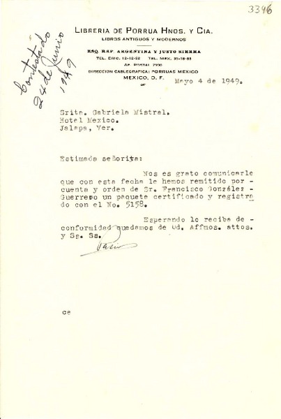 [Telegrama] 1949 dic. 20, México D.F. [a] Gabriela Mistral, Hotel Mocambo, Veracruz, [México] [manuscrito] Lopéz Hermanos S.A.