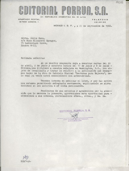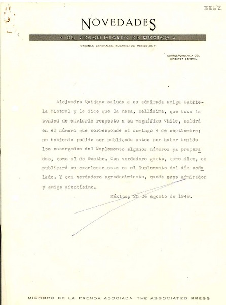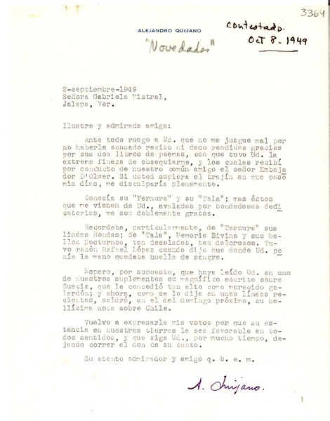 Mistral, Gabriela - Correspondencia - Manuscritos mexicanos - Autores mexicanos - Quijano, Alejandro