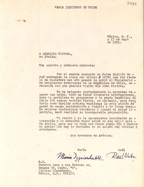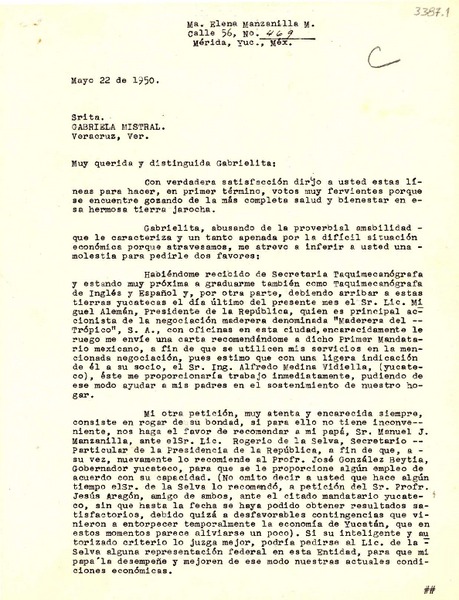 [Carta] 1933 mayo 20, México, D. F., México [a] Gabriela Mistral, Puerto Rico [manuscrito] Camilo Carrancá y Trujillo.