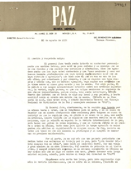 [Carta] 1942 ago. 29, Washington D.C., [EE.UU.] [a] Gabriela Mistral, Consulado de Chile, Petrópolis, Brasil [manuscrito] Pedro de Alba.