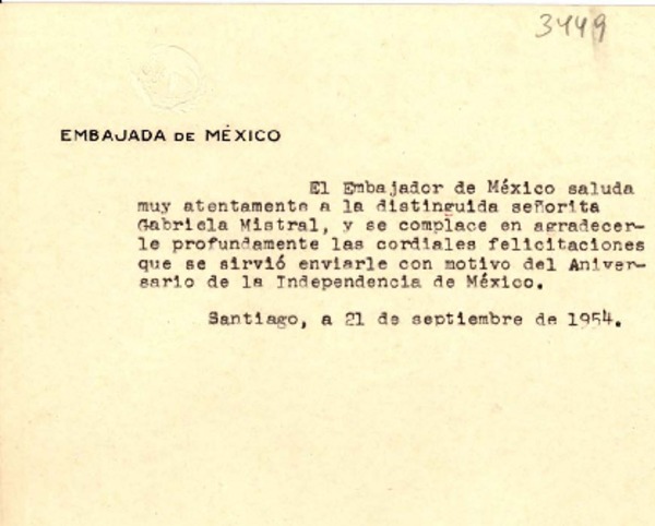 [Telegrama] 1953 sept. 12, México D.F. [a] Gabriela Mistral, New York, [EE.UU.] [manuscrito] Andrés Henestrosa.