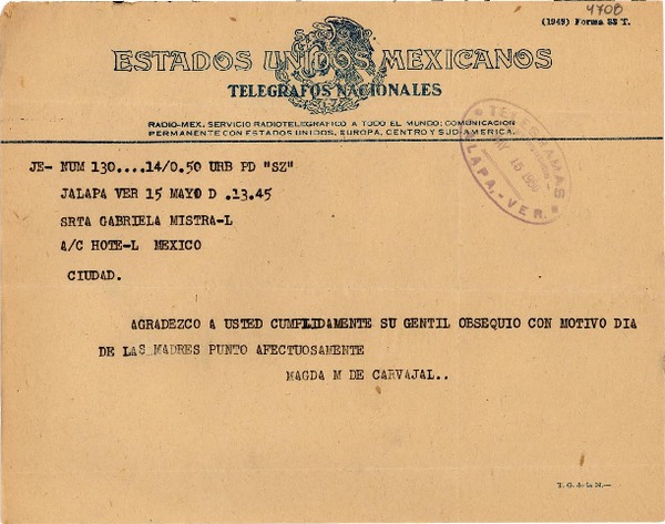 [Telegrama] 1950 mayo 15, Jalapa, Ver[acruz], México [a] Gabriela Mistral, Hotel México, México [manuscrito] Magda M. de Carvajal.