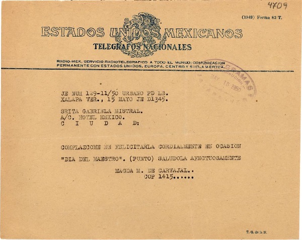 [Telegrama] 1950 mayo 15, Xalapa, Ver[acruz] [a] Gabriela Mistral, Hotel México, [México] [manuscrito] Magda M. de Carvajal.