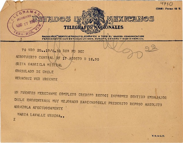 [Telegrama] 1950 ago. 17, [México] [a] Gabriela Mistral, Consulado de Chile, Veracruz, [México] [manuscrito] María Lavalle Urbina.