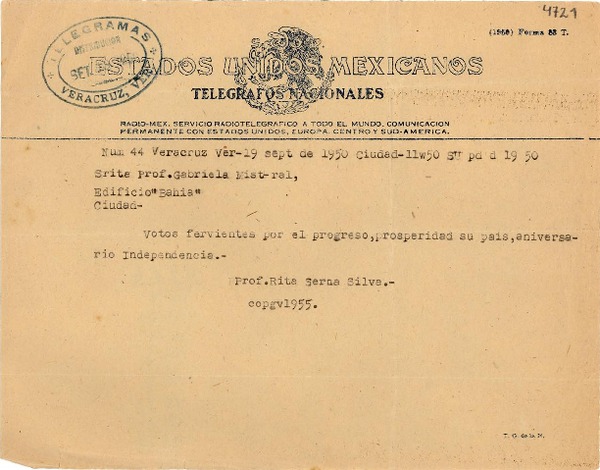 [Telegrama] 1950 sept. 19, Veracruz [a] Gabriela Mistral, Veracruz [manuscrito] Rita Serna Silva.
