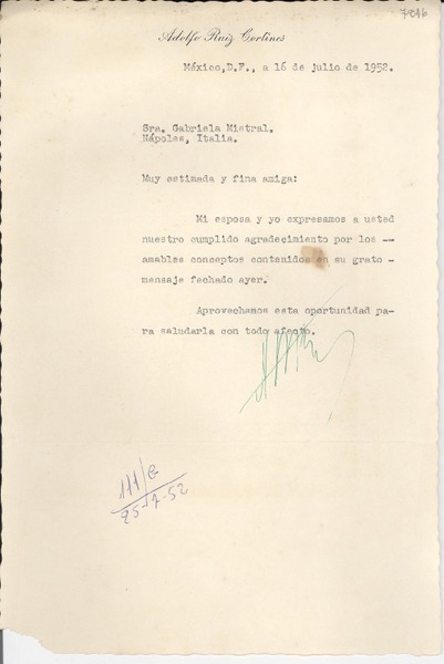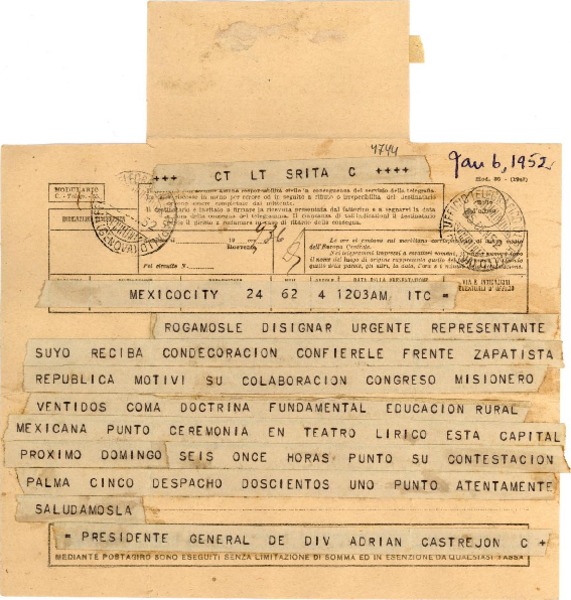 [Telegrama] 1952 ene. 6, México D.F. [a] Gabriela Mistral, Rapallo, [Italia] [manuscrito] Adrián Castrejón C.