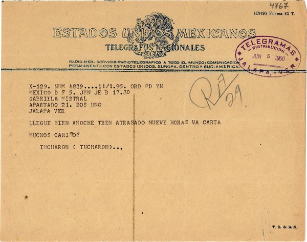 [Telegrama] 1950 jun. 5, México D.F. [a] Gabriela Mistral, Jalapa, Ver[acruz], México [manuscrito] De un amigo.