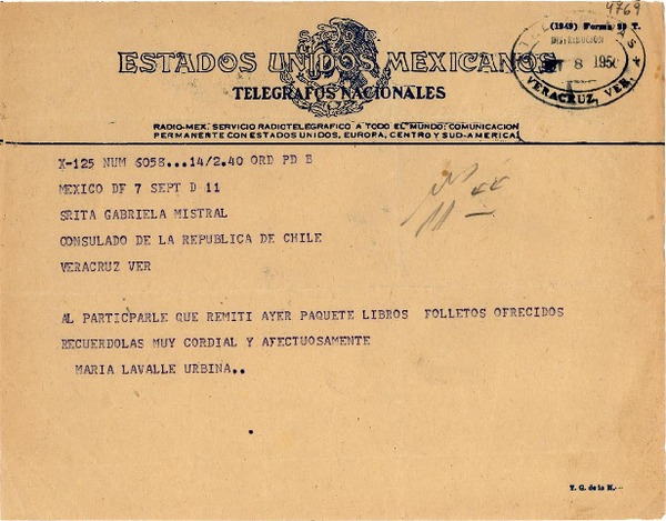 [Telegrama] 1950 sept. 8, México D.F. [a] Gabriela Mistral, Consulado de la República de Chile, Veracruz [manuscrito] María Lavalle Urbina.