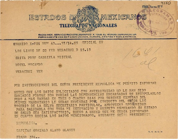 [Telegrama] 1949 feb. 22, Veracruz [a] Gabriela Mistral, Hotel Mocambo, Veracruz, [México] [manuscrito] Gonzalo Alamo Blanco.