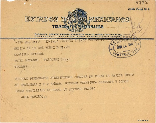 [Telegrama] 1949 abr. 14, México D.F. [a] Gabriela Mistral, Hotel Mocambo, Veracruz, [México] [manuscrito] José Acueros.