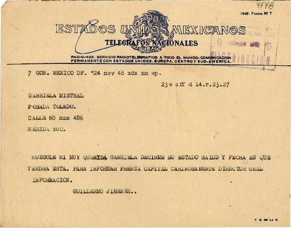[Telegrama] 1948 nov. 24, México D.F. [a] Gabriela Mistral, Mérida, Yuc[atán], [México] [manuscrito] Guillermo Jiménez.
