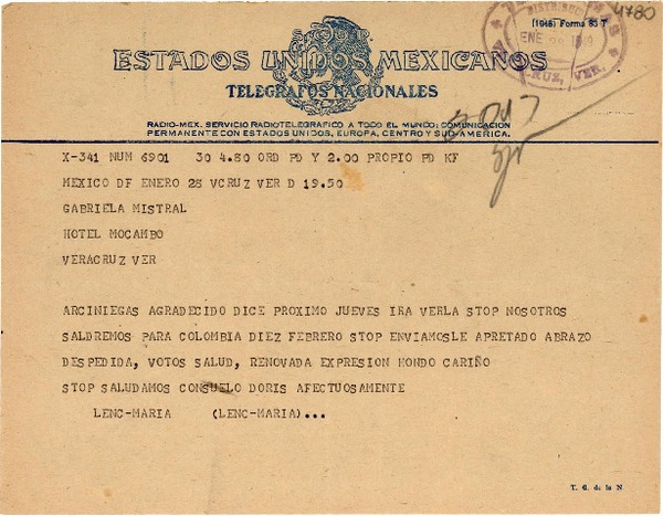 [Telegrama] 1949 ene. 28, México D.F. [a] Gabriela Mistral, Hotel Mocambo, Veracruz, [México] [manuscrito] De una amiga.