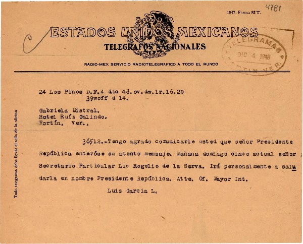 [Telegrama] 1948 dic. 4, Los Pinos, México D.F. [a] Gabriela Mistral, Veracruz [manuscrito] Luis García L.