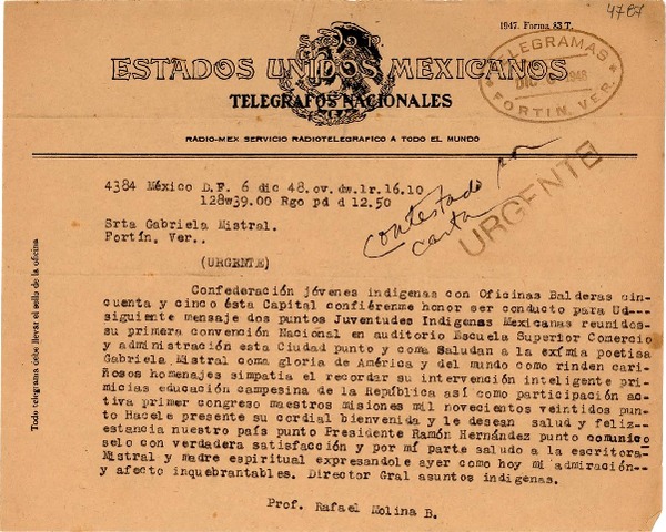 [Telegrama] 1948 dic. 4, México D. F. [a] Gabriela Mistral, Hotel Ruíz Galindo, Fortín, Veracruz [manuscrito] José Vasconcelos.