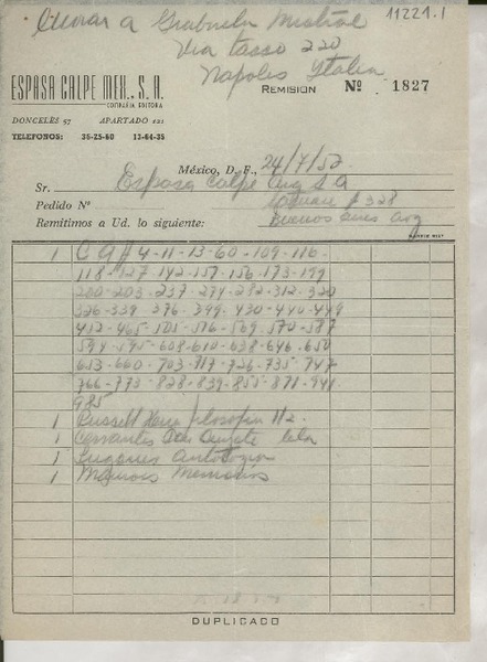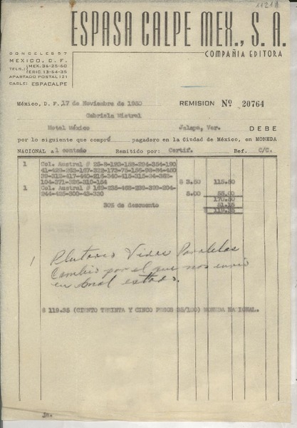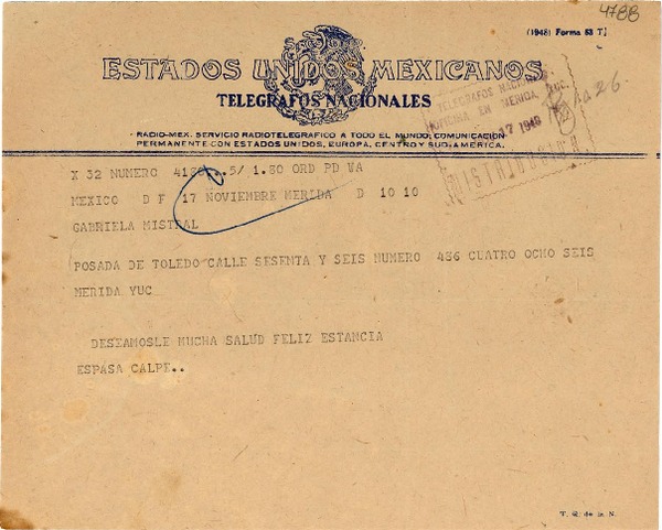 [Telegrama] 1948 nov. 17, México D. F. [a] Gabriela Mistral, Merida [manuscrito] Espasa Calpe.