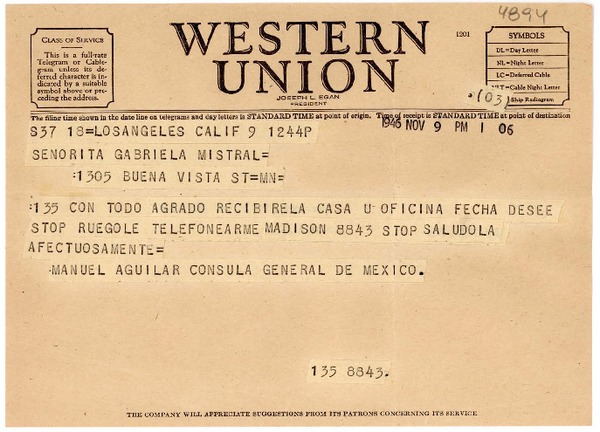 [Telegrama] 1946 nov. 9, Los Angeles, [EE.UU.] [a] Gabriela Mistral [manuscrito] Manuel Aguilar.