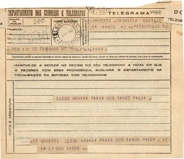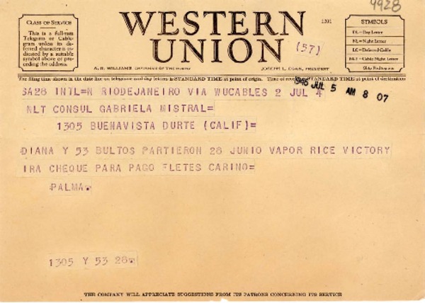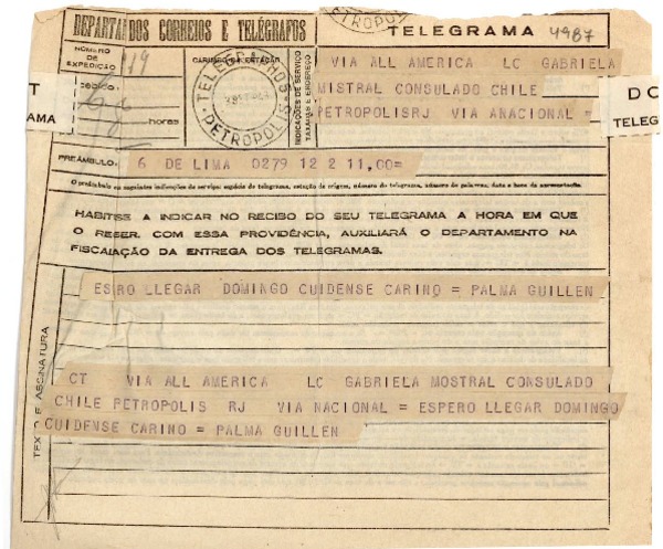 [Telegrama] 1946 jul. 5, Rio de Janeiro, [Brasil] [a] Gabriela Mistral, Duarte, Calif., [EE.UU.] [manuscrito] Palma [Guillén de Nicolau].