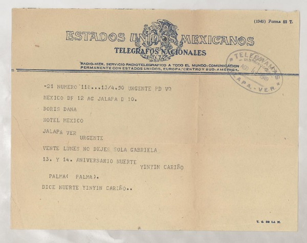 [Telegrama] 1949 ago. 12, México D. F. [a] Doris Dana, Jalapa, Veracruz [manuscrito] Palma Guillén.