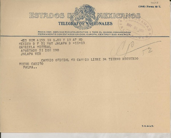 [Telegrama] 1950 mayo 21, México D. F. [a] Gabriela Mistral, Jalapa, Veracruz [manuscrito] Palma Guillén.