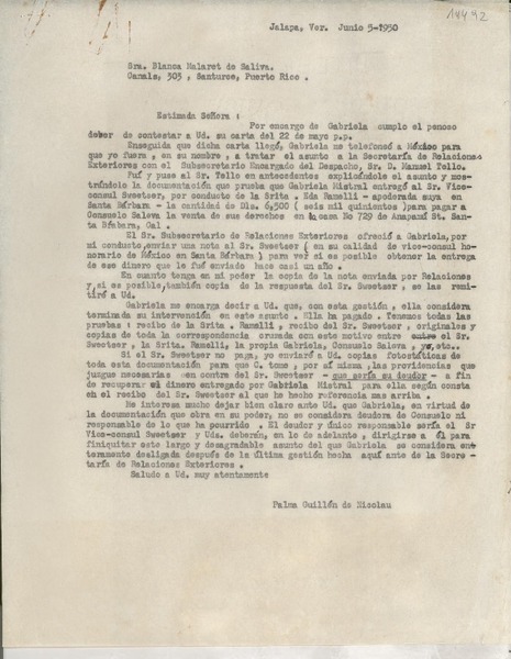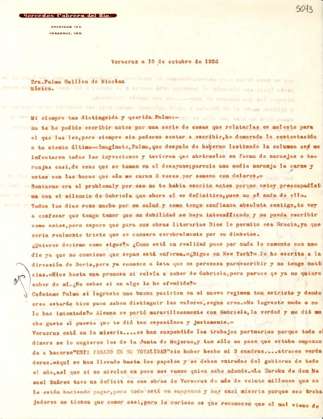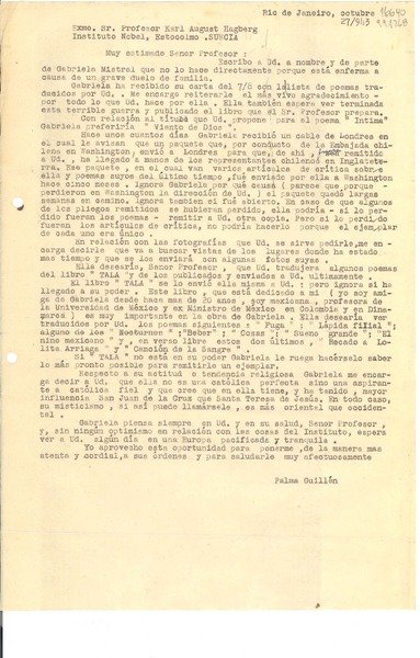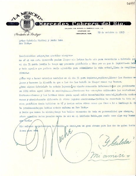Guillén de Nicolau, Palma - Manuscritos mexicanos - Correspondencia - Mistral, Gabriela