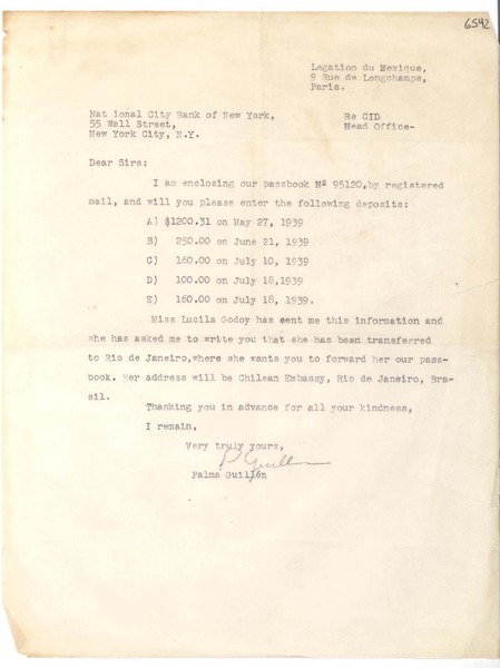 [Carta] 1939, París [a] National City Bank of New York, New York [manuscrito] Palma Guillén.