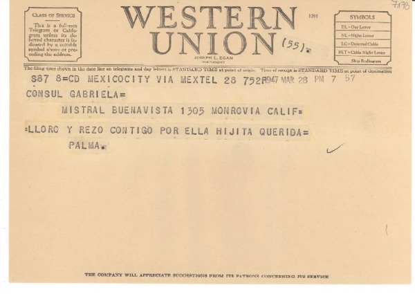 [Telegrama] 1947 mar. 28, México City, [México] [a] Gabriela Mistral, Monrovia, Calif., [EE.UU.] [manuscrito] Palma [Guillén].