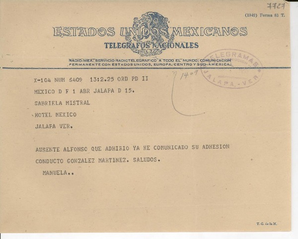 [Telegrama] 1950 abr. 1, México D. F. [a] Gabriela Mistral, Jalapa, Veracruz [manuscrito] Manuela [Mota].