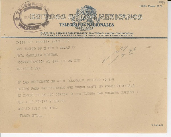 [Telegrama] 1950 feb. 2, México D.F. [a] Gabriela Mistral, [Veracruz, México] [manuscrito] Adolfo Ruíz Cortines.