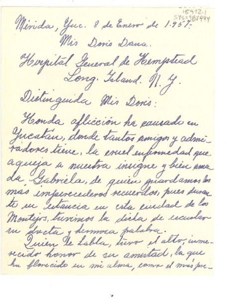[Telegrama] 1957 jan. 9, New York, [Estados Unidos] [a] Doris Dana, Hempstead Hospital, New York, [Estados Unidos] [manuscrito] Graciela y Andrés Iduarte.