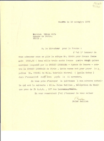 [Carta] 1938 nov. 10, Geneve, [Suisse] [al] Director de Norwich Union Life, Agence de Paris, Paris, [Francia] [manuscrito] Palma Guiilén.