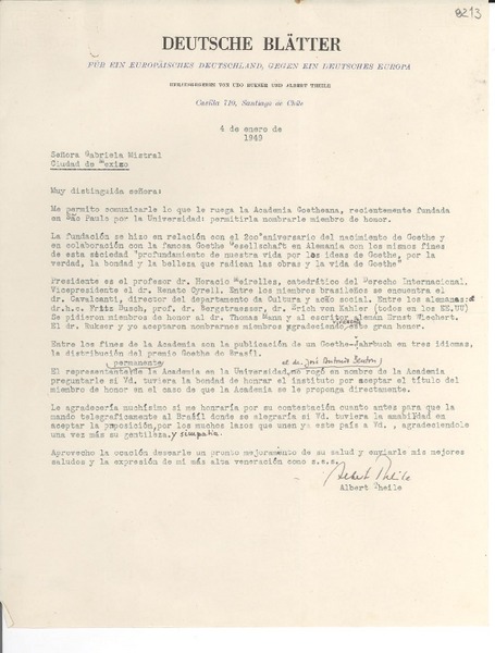 [Carta] 1945 abr. 9, [Santiago] [a] Gabriela Mistral, Petrópolis [manuscrito] Albert Theile.