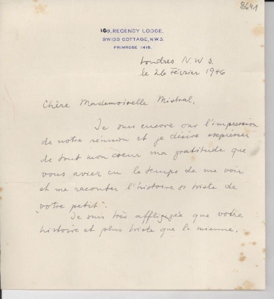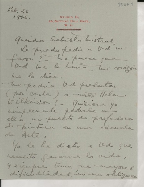 [Carta] 1946 feb. 26, Londres, [Inglaterra] [a] Gabriela Mistral [manuscrito] Hannah Altmann.
