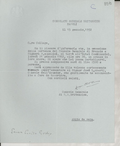 [Carta] 1952 genn. 15, Napoli, [Italia] [a] Caro Collega [Gabriela Mistral] [manuscrito] Console Generale di S. M. Britannica.