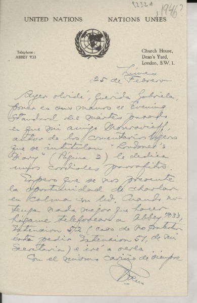 [Carta] 1946 feb. 26, Londres, [Inglaterra] [a] Gabriela Mistral [manuscrito] María Samora.