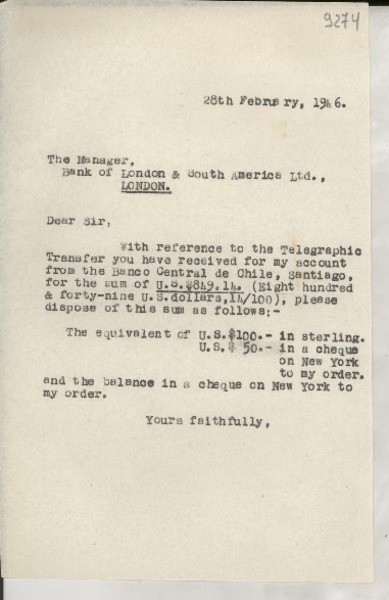 [Carta] 1946 Feb. 28, Londres, [Inglaterra] [a] Gabriela Mistral [manuscrito] Administrador del Banco de Londres.